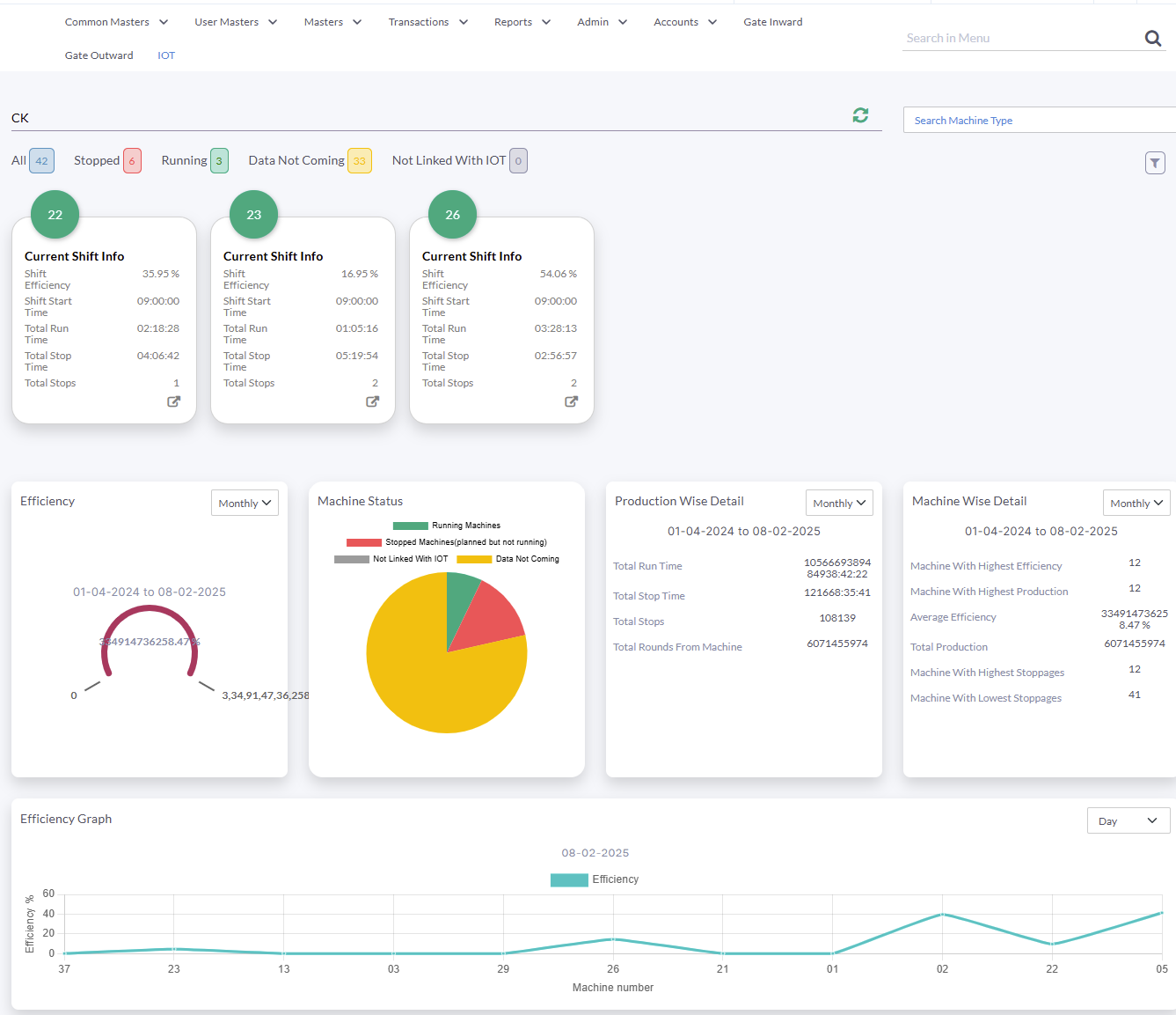 The IoT-powered live production machine monitoring provides real-time updates on machine status, tracking running time, downtime, and production output. It automates performance logging and analyzes machine efficiency by comparing active and idle times. and offers comprehensive production data, enabling informed decision-making and optimizing performance. By streamlining data tracking, it helps improve operational efficiency, reduce downtime, and drive productivity across the production line.